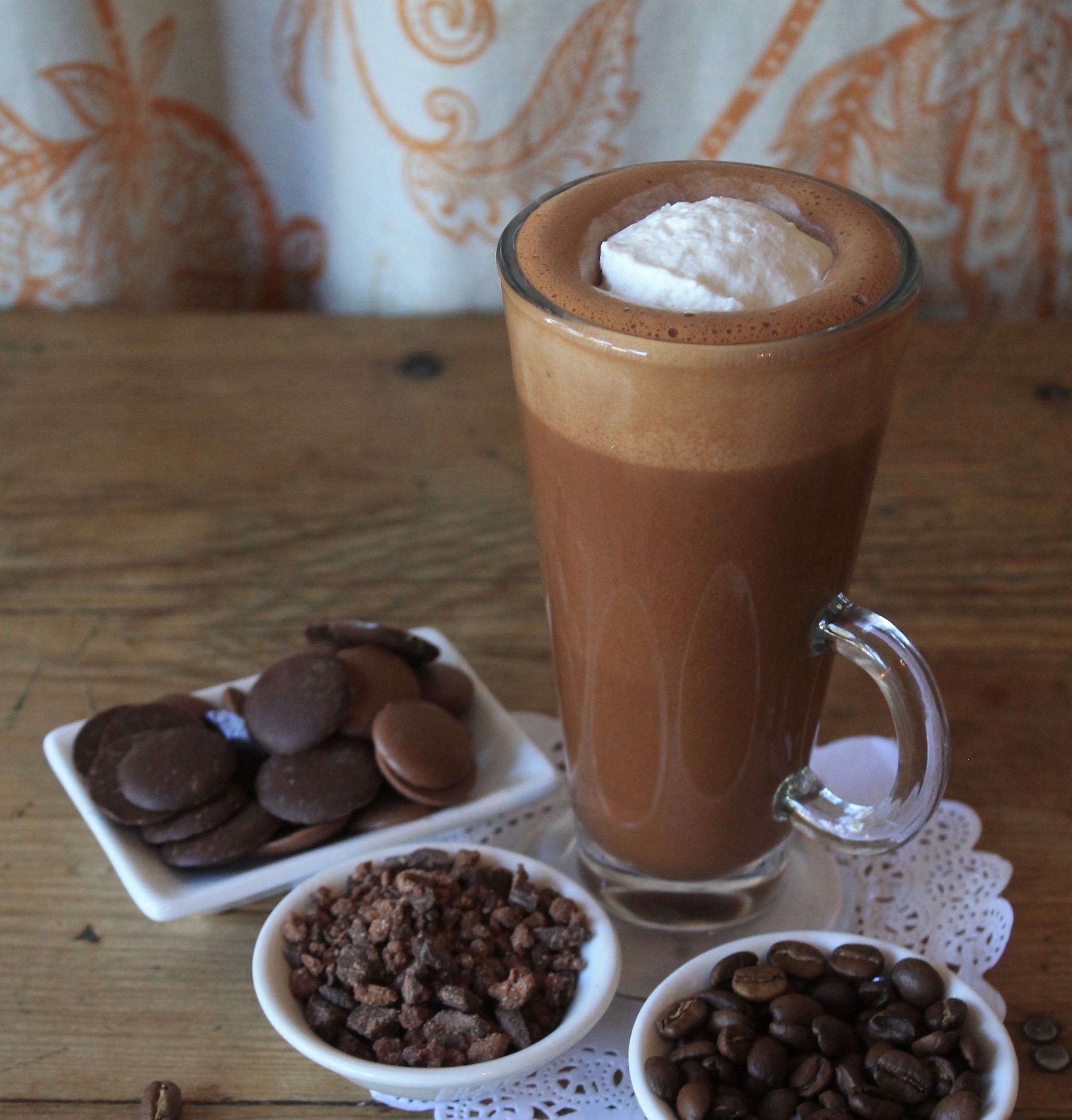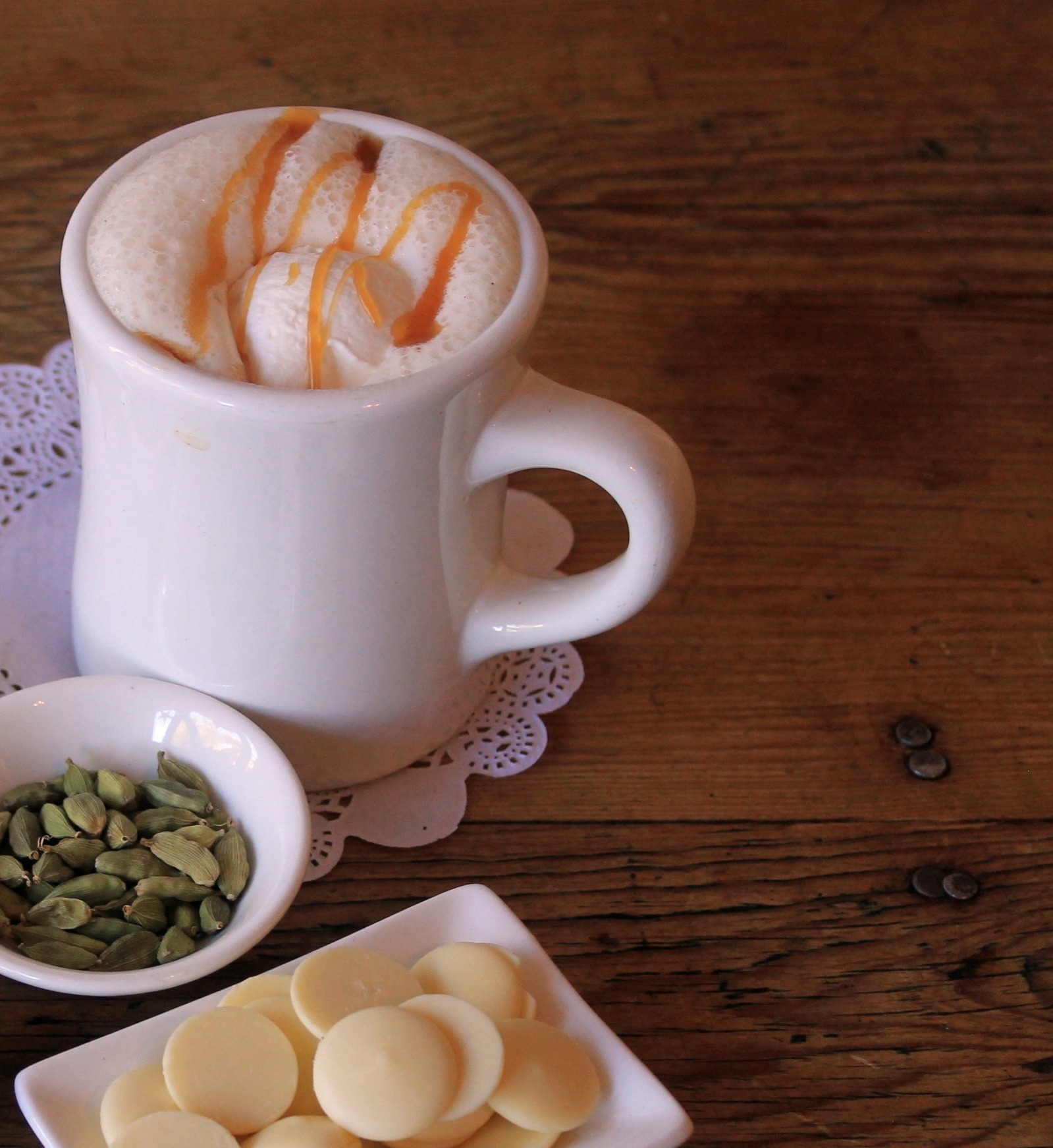 An exquisite creamy white chocolate hot chocolate with cardamom and caramel.
