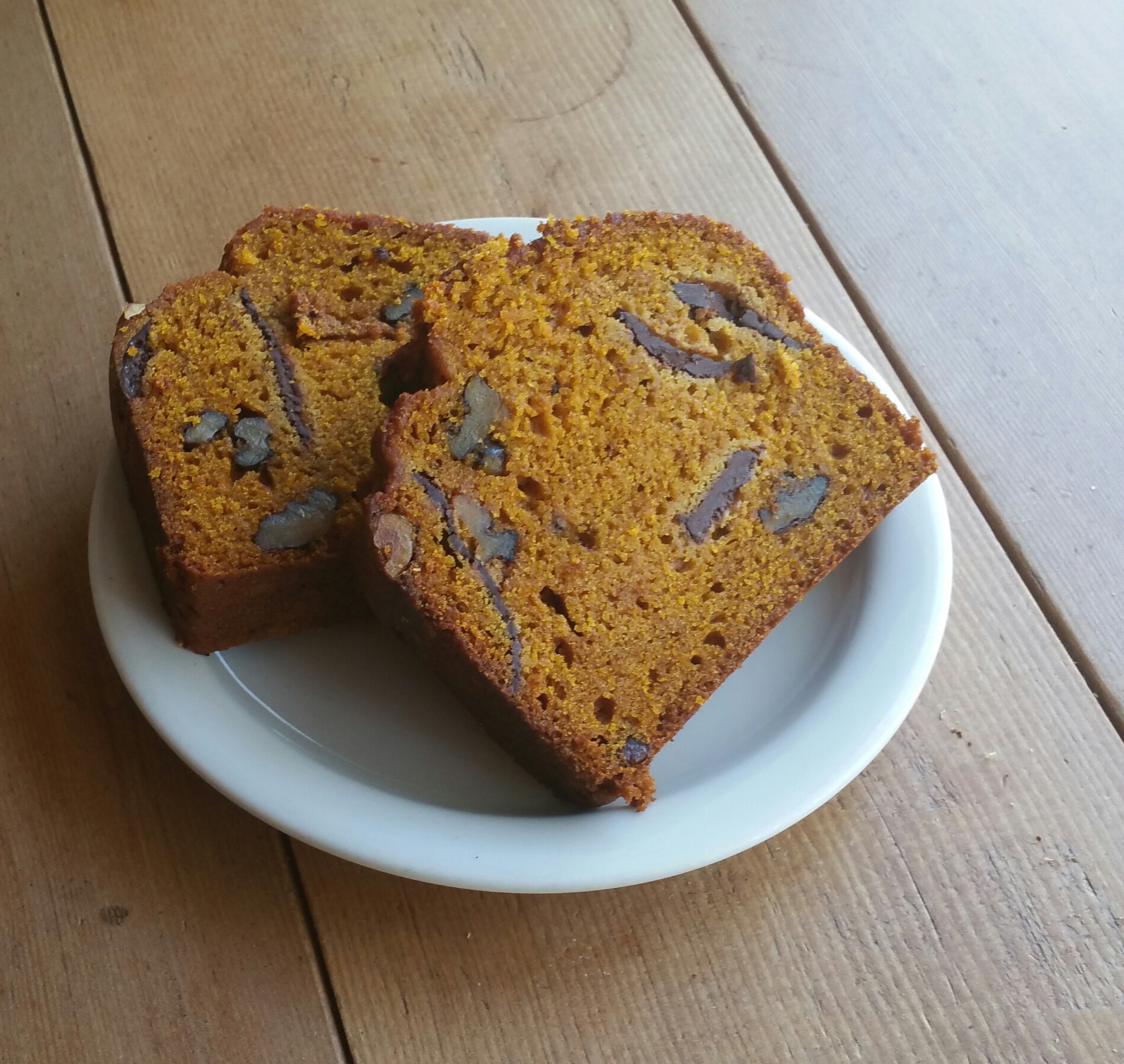 A dense, moist pumpkin spice bread with dark chocolate, crystalized ginger and walnuts