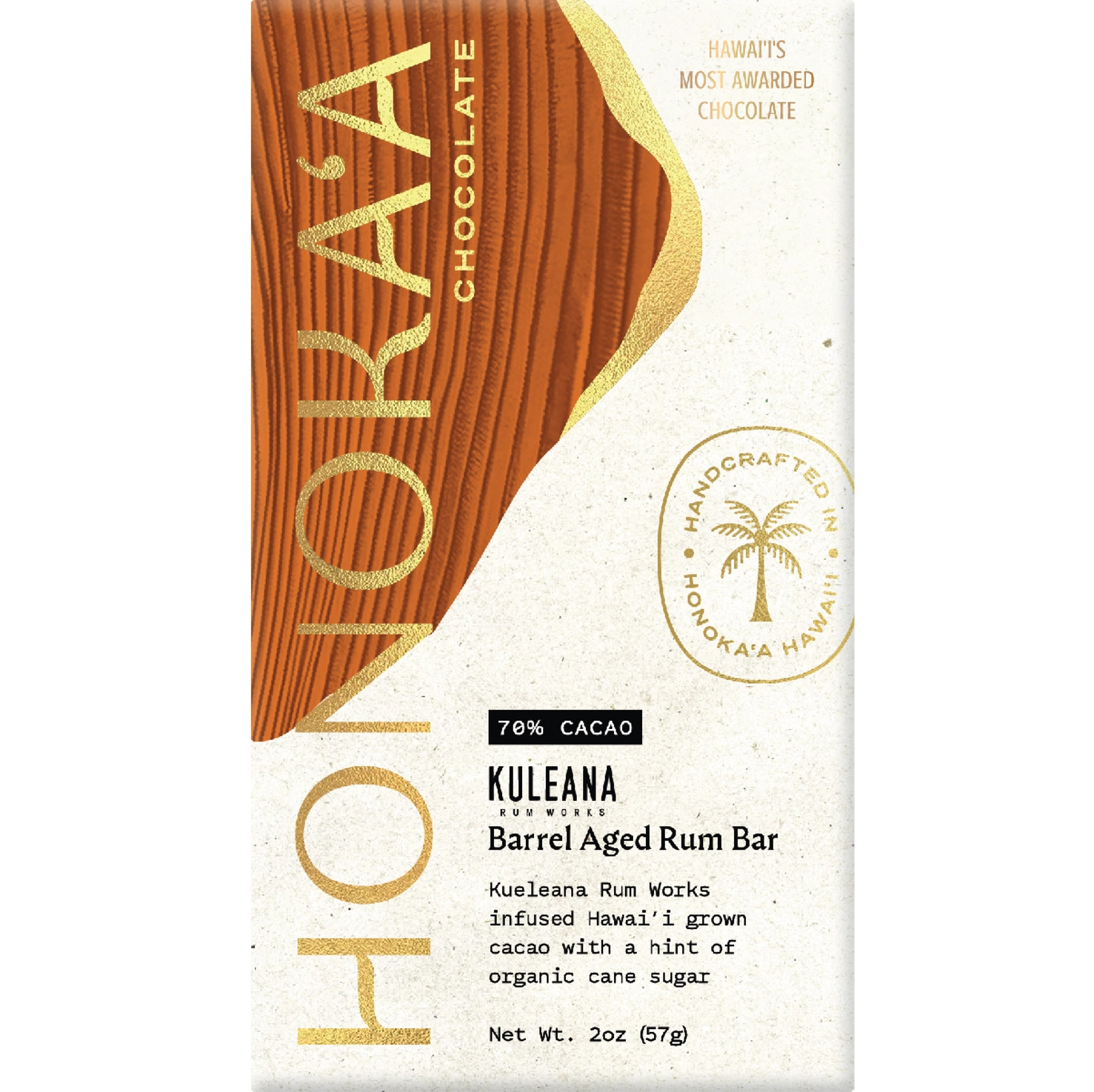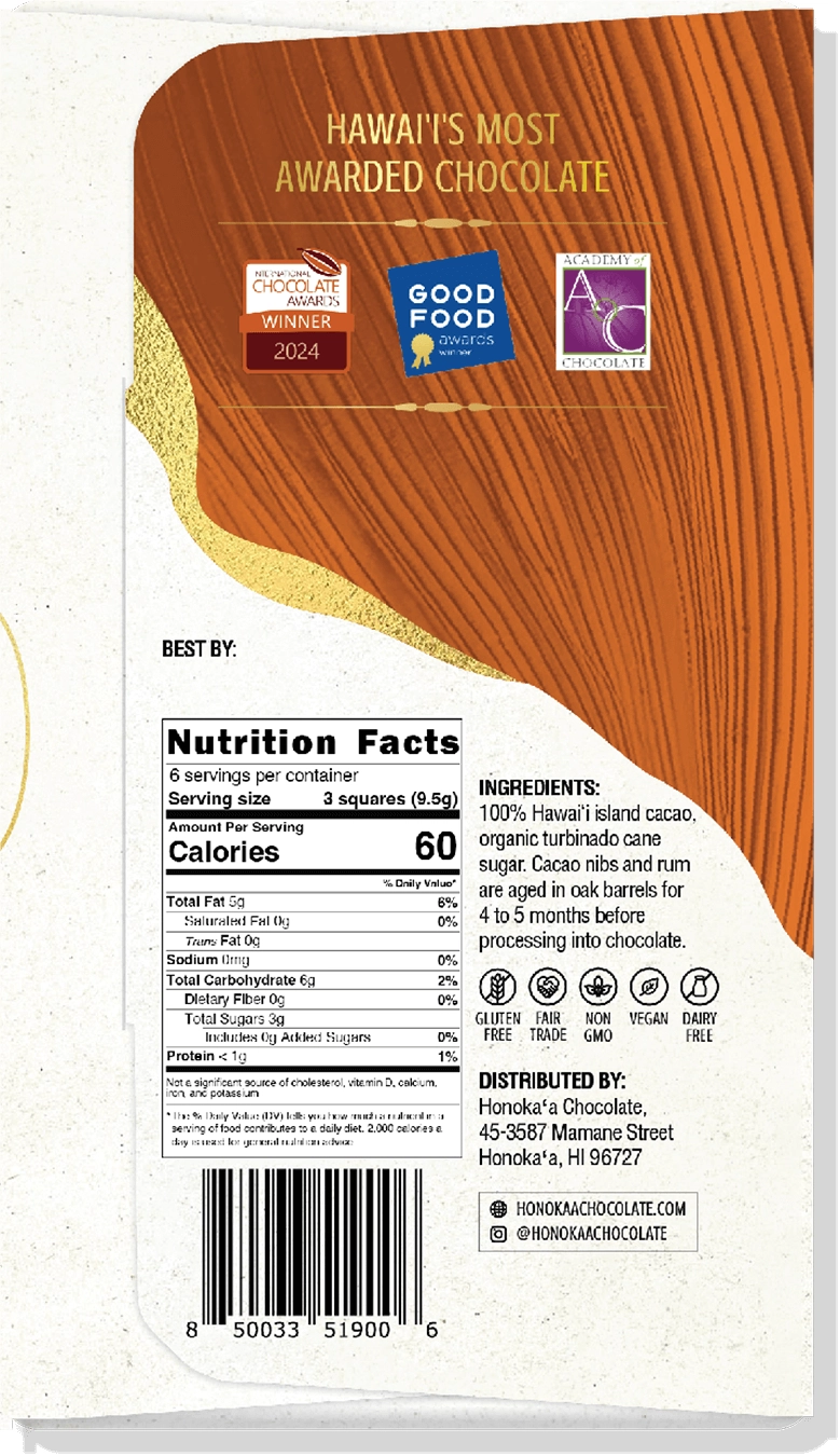 100% Hawaii island cacao, organic turbinado cane sugar, Cacao nibs and rum are aged in oak barrels for 4-5 months before processing into chocolate