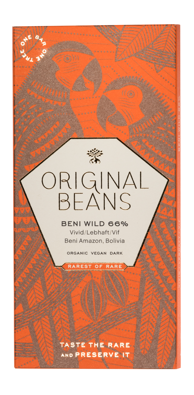 Hints of floral honey, apricot and jasmine tea are present in this rarest of rare cacao. The taste leads to the wild cacao trees on Amazon forest islands, home to the vivid blue-throated macaw. One bar : One tree Each purchase of the vivid Beni Wild 66% helps to preserve this natural wonderland and its wild inhabitants.