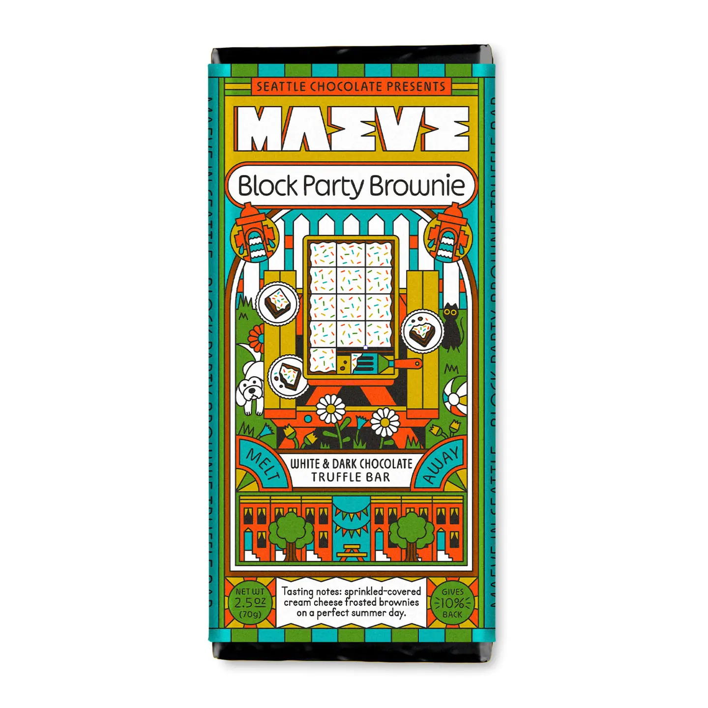 Sprinkled-covered cream cheese frosted brownies on a perfect summer day. Flavor: White chocolate top layer, fudgy dark chocolate center generously sprinkled with confetti, and all natural flavor.
