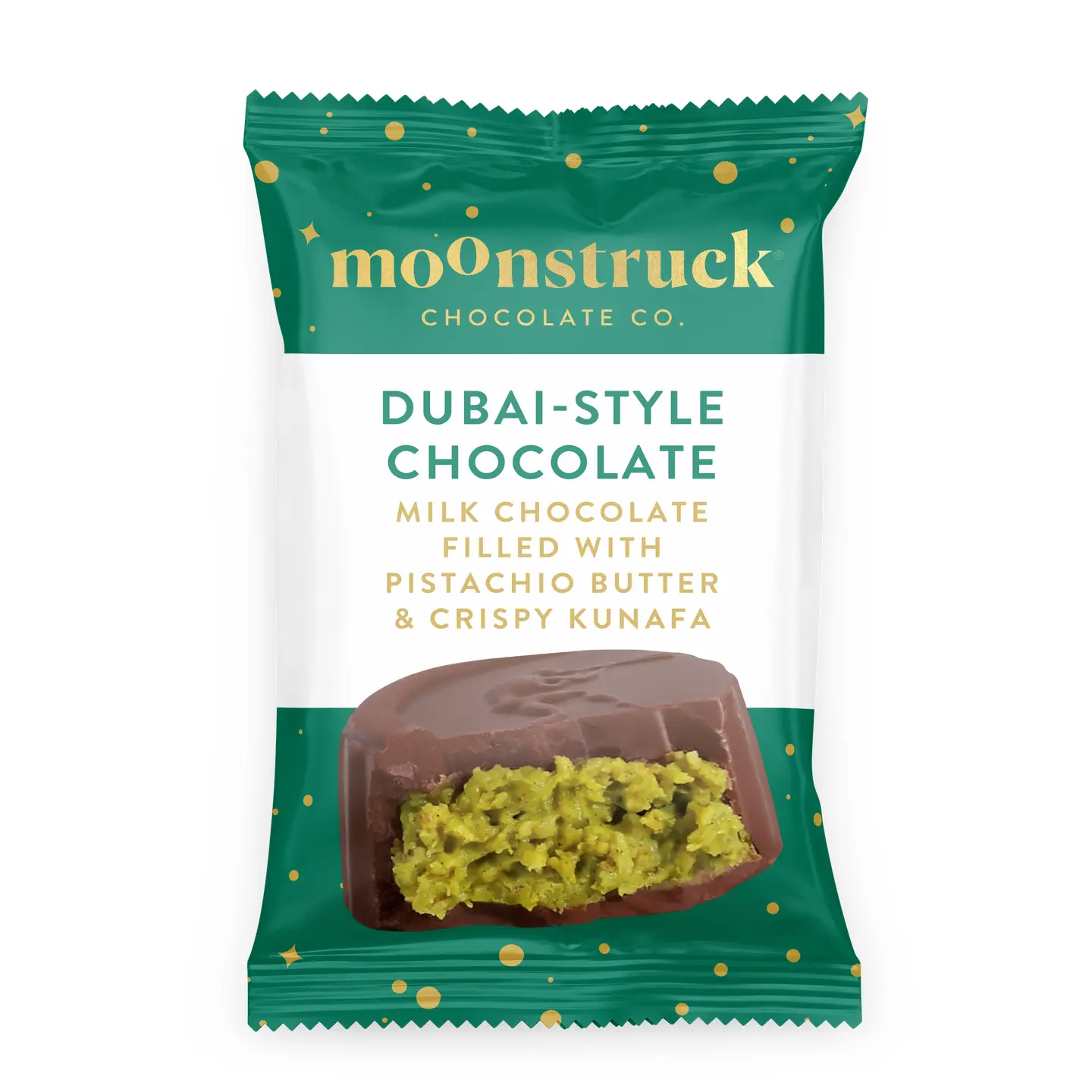Moonstruck Chocolate Dubai chocolate truffles, wrapped for individual sale. Milk chocolate filled with pistachio butter and crispy kunafa.