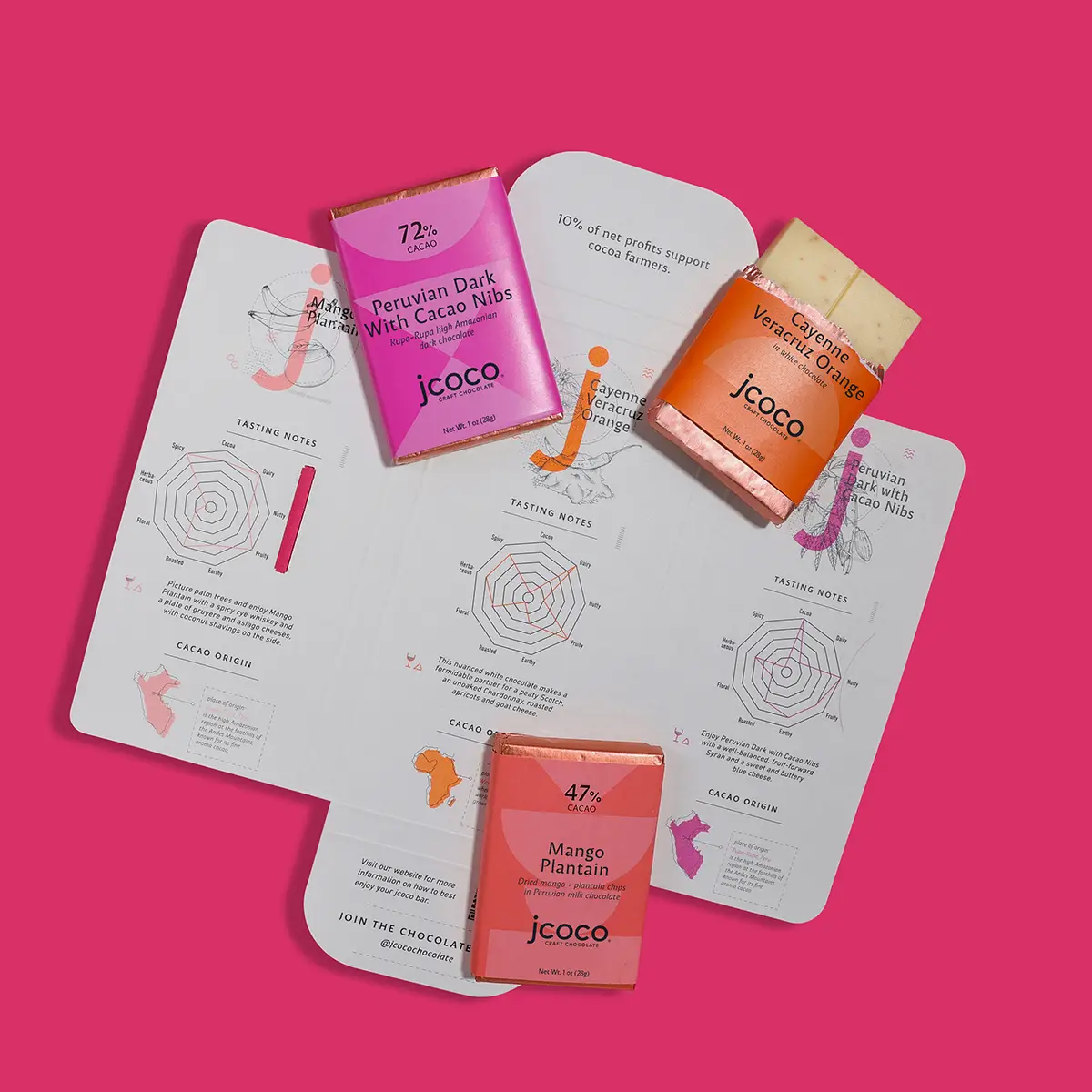 Experience three lush flavors of the Tropics in this chocolate flight that includes high percentage cacao milk, 72% dark and a surprising white chocolate made with pure cocoa butter. Together the three deliver a fruity, salty, and undeniably satisfying adventure that's hot, hot, hot. Includes three 1oz mini bars each of: Mango Plantain (milk), Cayenne Veracruz Orange (white), and Peruvian Dark with Cacao Nibs (dark).