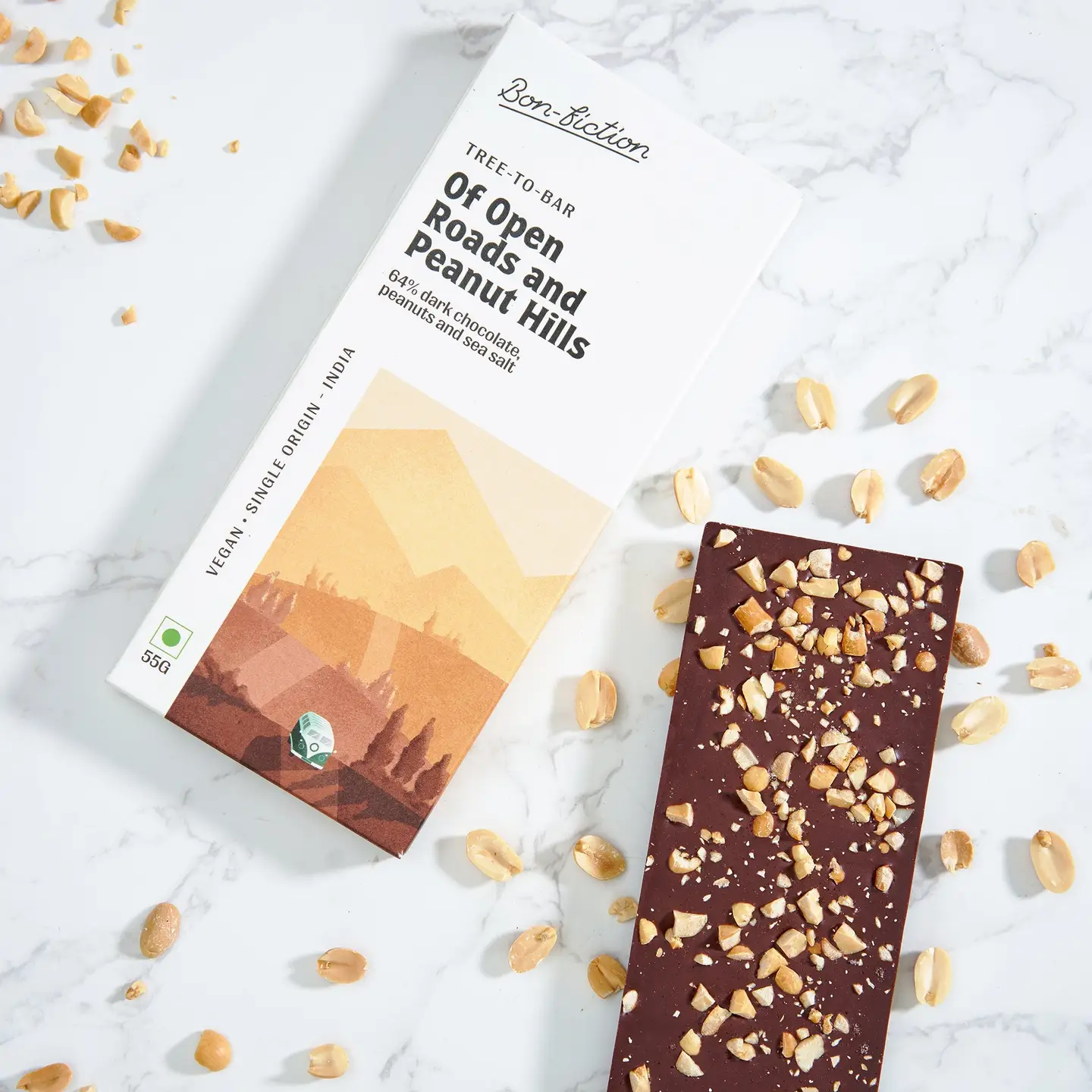 For the peanut lover in you, this peanut ground into chocolate bar with just the right amount of Arabian sea salt is just the dose of peanut love we all need, this 64% Peanut Dark Chocolate bar comes with the the goodness of peanut flavor.