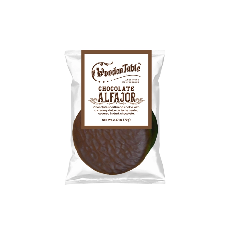 "Indulge in the rich and decadent flavor of our Dark Chocolate Alfajores! The Wooden Table Baking Company offers a twist on the traditional alfajores cookie with a version dipped in semi-sweet chocolate."